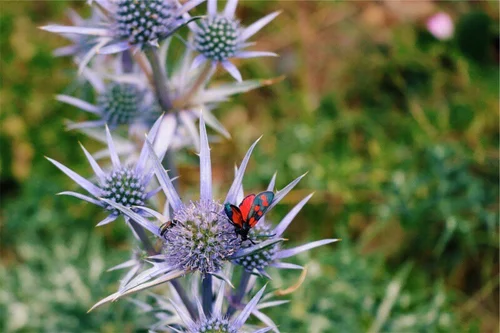 In the Pyrenees of Spain, this image depicts a red flower contrasted against greenery in the background and a lavender-colored plant in the middle ground.