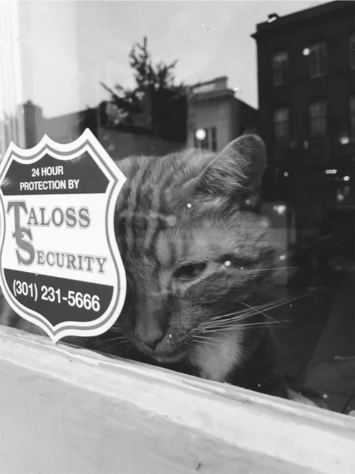 A cat at a store window; photo taken from outside the store looking in—in black and white for dramatic effect.